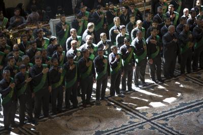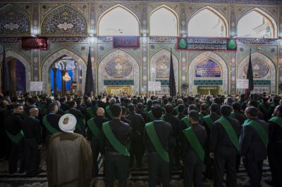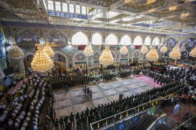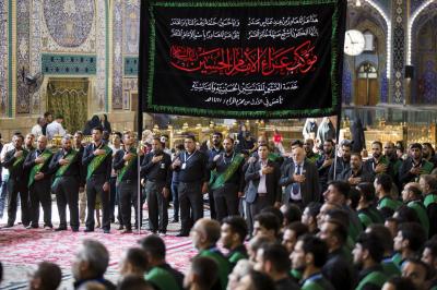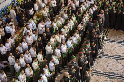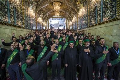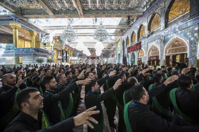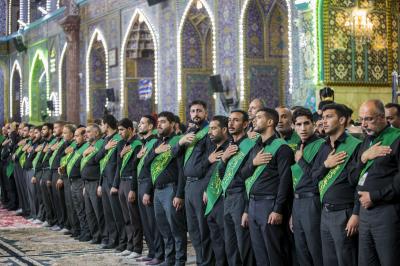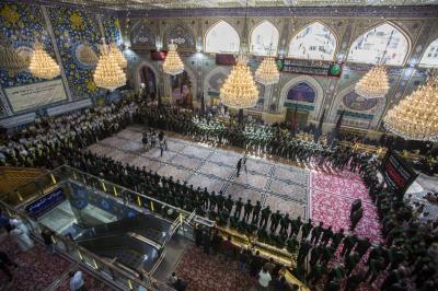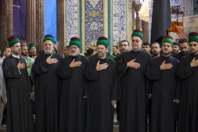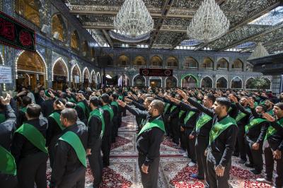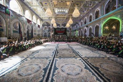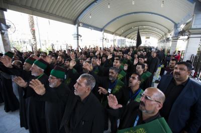 La procession de condoléances des serviteurs du sanctuaire sacré d'al-Abbas (p) était organisée sous forme de groupes chantant des élégies, puis se dirigeait vers le sanctuaire de l'Imam al-Hussein (paix soit sur lui) pour présenter les condoléances pour cette triste occasion, en passant à travers la zone située entre les deux sanctuaires sacrés, pour être accueillie par les serviteurs de l'imam al-Hussein (la paix soit sur lui) avec des expressions de chagrin et de tristesse pour tenir ensemble un majlis de condoléances et de lamentations dans le sanctuaire sacré d'Imam al-Hussein (paix soit sur lui).