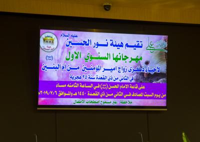 این جشن با عنوان «جشن تاسیس اولین جشنواره سالیانه ازدواج ام البنین و حضرت امیرالمومنین (علیهما السّلام) در سالن امام حسن مجتبی (علیه السّلام) و با تلاوت آیاتی چند از قرآن کریم توسط قاری دو آستان مقدس حسینی و عباسی حاج مصطفی الصراف برگزار شد.