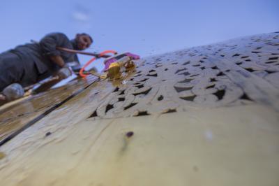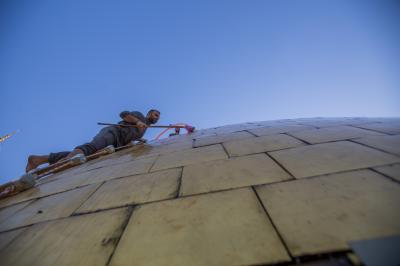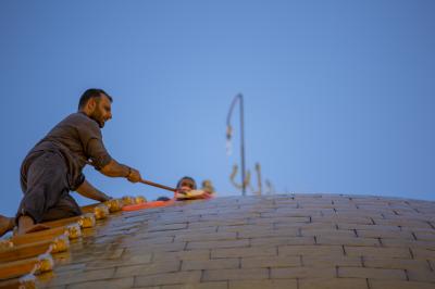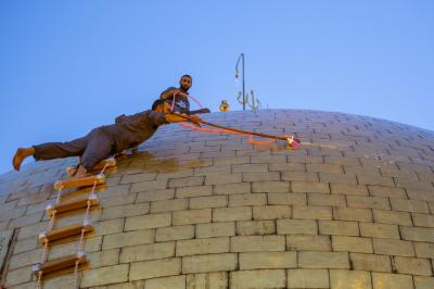 Er fügte hinzu: " Die Arbeiten folgen in einer bereits festgelegten Reihe, und wir verwenden nur Reinigungsmitteln, die die Vergoldungsschicht der heiligen Kuppel nicht angreifen, anschließen wird jeder Bereich mit speziellem Tuch poliert." "Wir hoffen, dass wir morgen mit den Arbeiten fertig werden, danach sind die beiden Türme an der Reihe".