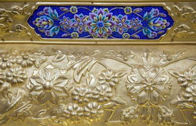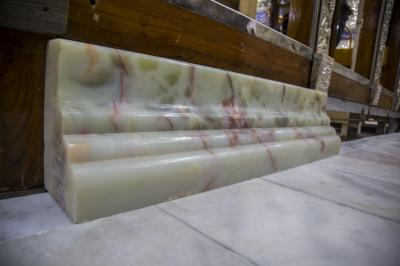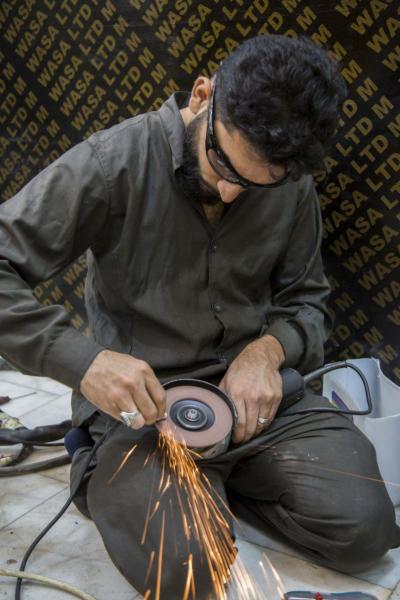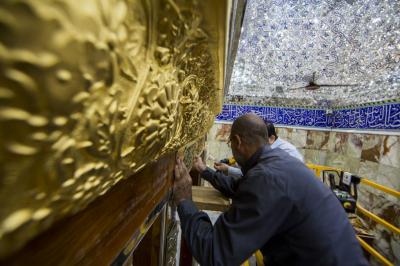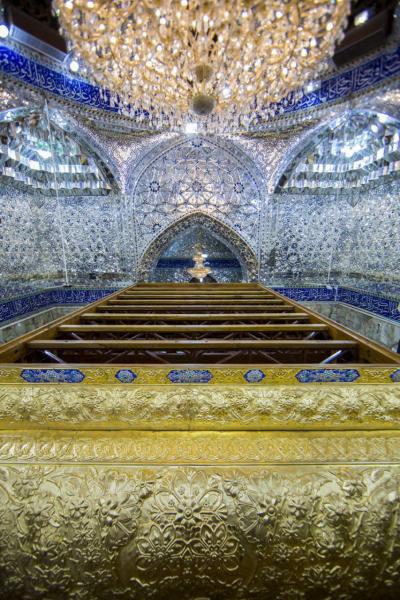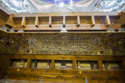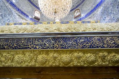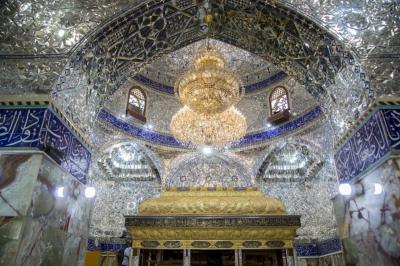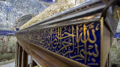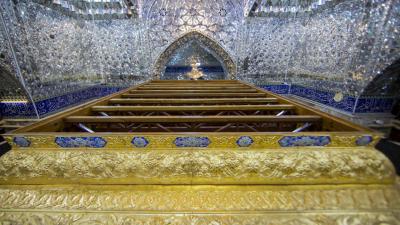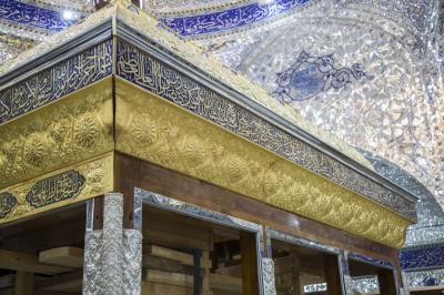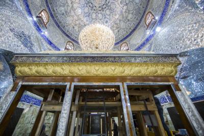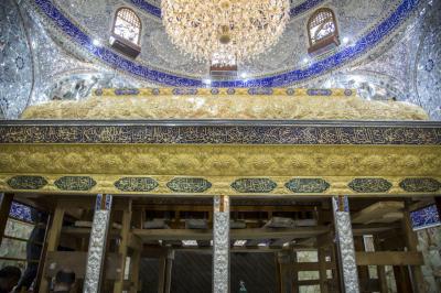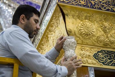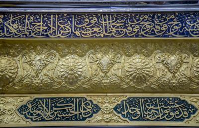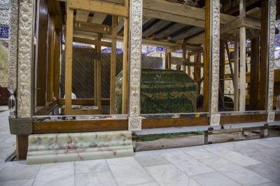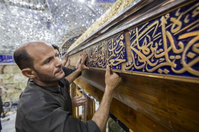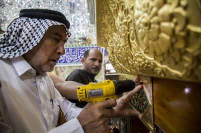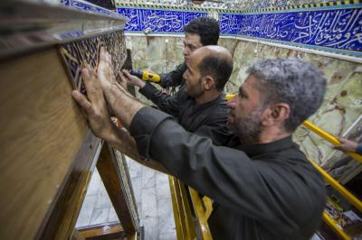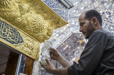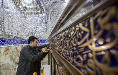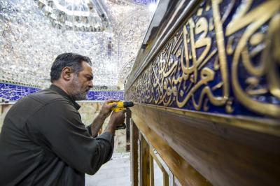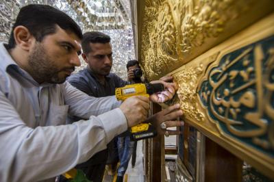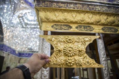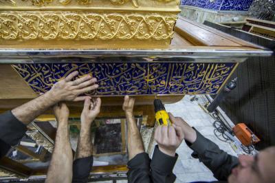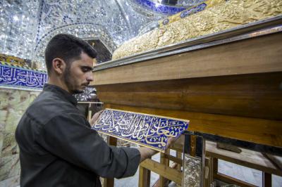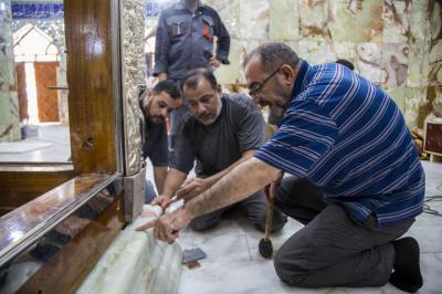 Der Fabrikdirektor Sayed Nadem Jassem Al-Ghurabi sagte: " Im 3. Tag in Folge laufen ununterbrochen die Arbeiten zum Einbau des neunen Schaugitterfenster der Grabstätte von Al-Qassem-Friede sei mit ihm- Sohn von Imam Al-Kadem -Friede sei mit ihm-, heute haben unsere Fachkräfte die Kaligrafische Ausfertigung der Surat Al-Nour (Licht) und einige Ruhmgedichten sowie das Mittelteil".