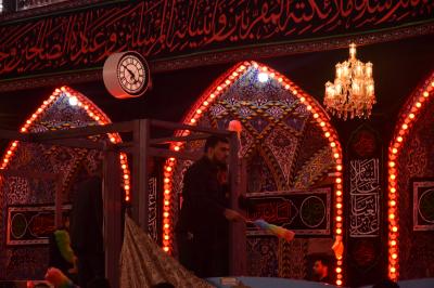 He also pointed out: "The members of the department also worked to help the disabled and the elderly to perform the rituals of Ziyarat and supplication, and they also prepare the place for the congregational prayer, so there's no intersection with the movement of visitors, in addition to perfuming the holy sanctuary with the finest perfumes in accordance with the numbers of visitors and the high temperatures, as well as providing the bookshelves of the sanctuary with the books of Ziyarat and supplication required by visitors.