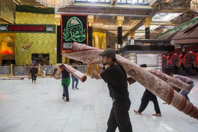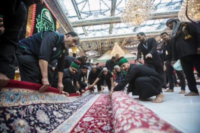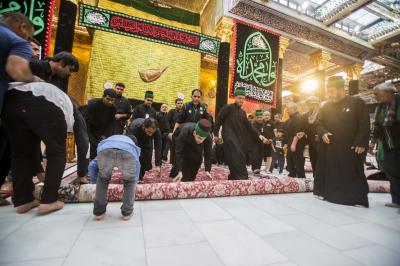 Les travaux auxquels a participé un certain nombre de visiteurs, sont le retrait de la moquette mise en place avant la ziyarat, le nettoyage, entretien et mise d’encens et parfum puis tapissage de la nef avec des tapis.