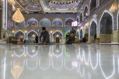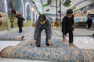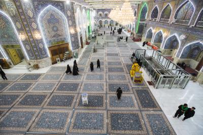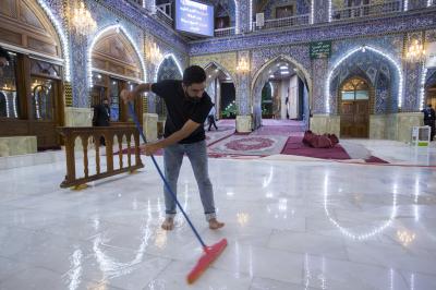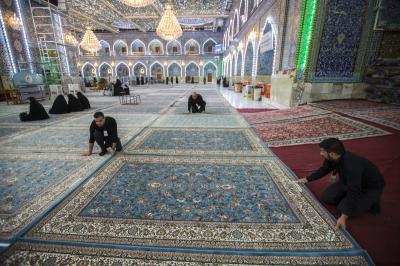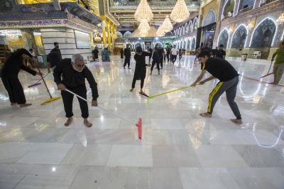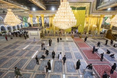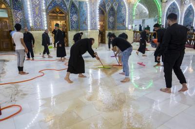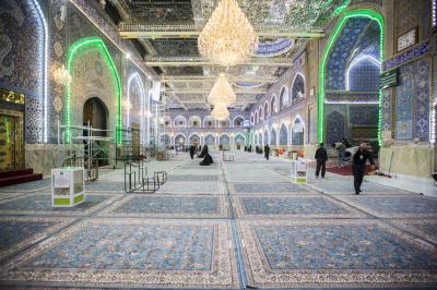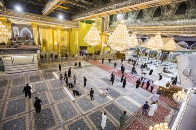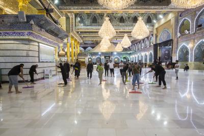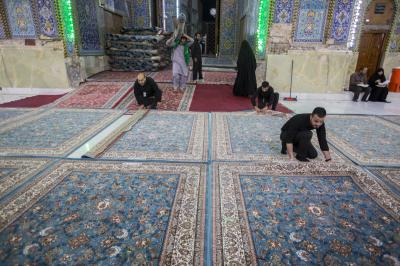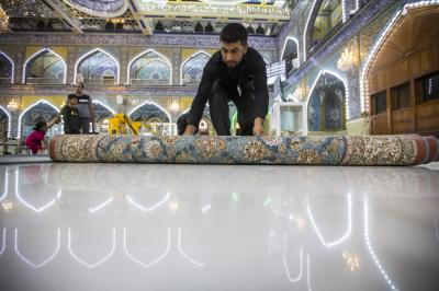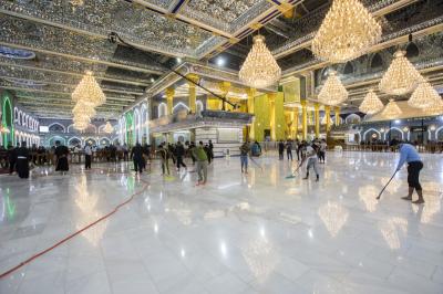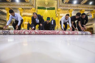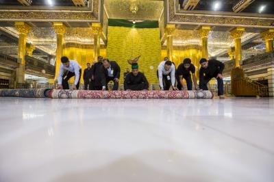 After the end of the Hussayni mourning season; the months of Muharram and Safar, and as is customary in the al-Abbas's (p) Holy Shrine, the Care Department of the Holy Shrine covered the floor of the shrine with a new carpet, to welcome the month of Rabi al-Awwal, preceded by washing and perfuming the floor.