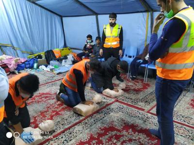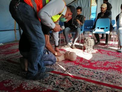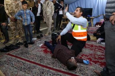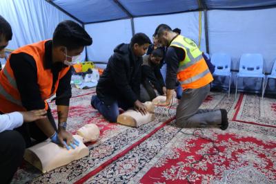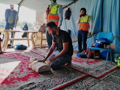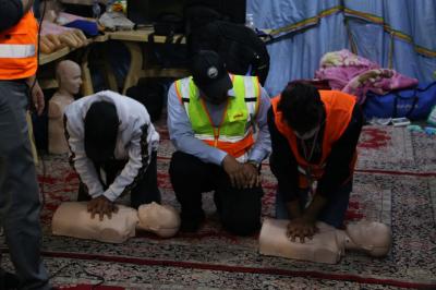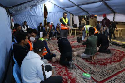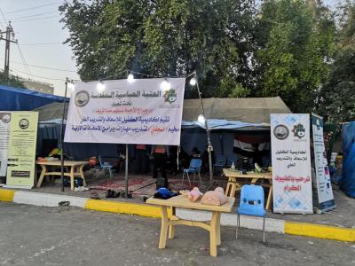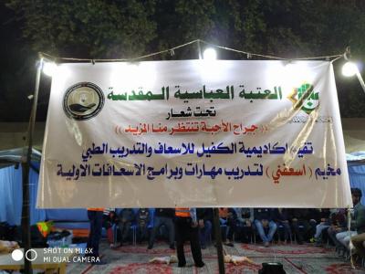 L’académie de série des services fourni par le sanctuaire saint Al Abbas aux manifestants, demandant leurs droits légitimes garanties par la constitution irakienne et soutenue par l’autorité religieuse suprême, l’académie des ambulanciers et formation médicale Al Kafeel a ouvert une tente pour la formation sur les premiers secours, que tous manifestants doivent connaître ses bases afin de limiter l’étendue des blessures s’il y en a.