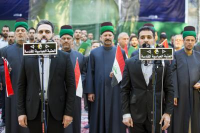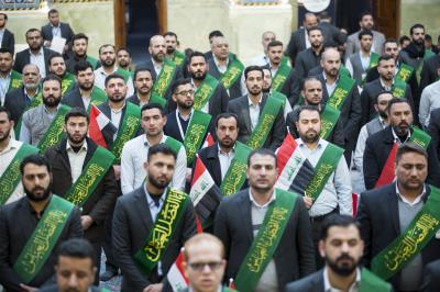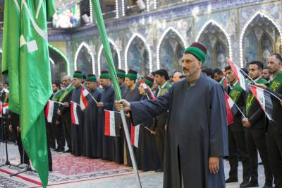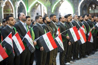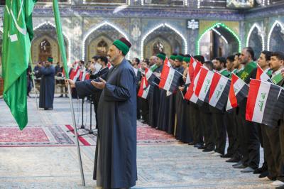 Le Lundi après-midi 3 Joumada I 1441 AH correspondant au 30 Décembre 2019, les serviteurs de la lune de Baní Hachim (paix sur lui) se sont réuni pour effectuer ce rituel de loyauté, après la lecture de la ziyarat Al Maahouda et l’hymne du sanctuaire saint Al Abbas (p) et la salutation au Mawla Aba Al Fadl Al Abbas (p), leurs voix ont retentit avec des supplications et de belles paroles pour l’amour de l’Irak, avec la participation d’un groupe de visiteurs portant les drapeaux de l’Irak et priant pour les martyrs de ce pays.