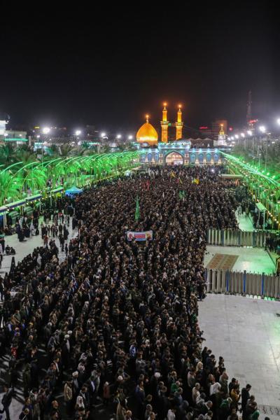 Dort wurde sie von den beiden geistlichen Bevollmächtigten der Beiden Heiligen Husseinitischen und Abbassitischen Stätten, deren Vorstandsmitglieder, sowie von Bediensteten der beiden Heiligen Stätten begrüßt. An dieser Leichnamen und Trauerprozession haben viele aus der Führungsriege der Sicherheits- und Streitkräfte, Persönlichkeiten aus der Gesellschaft, sowie eine Vielzahl aus den Bewohnern der Heiligen Stadt Karbalaa und der Besucher der Heiligen Stätten dort teilgenommen. Die Trauerprozession startete von der Qibla-Straße, die zum Heiligen Abbassitischen Schrein führt, in Richtung des Heiligen Schrein des Herren der Märtyrer Imam Al-Hussein -Friede sei mit ihm-, dort wurde sie von seiner Eminenz Scheikh Abd Al-Mahdi Al-Karbalaai empfangen. Nachdem dort die Ziyarat in ihren Namen durchgeführt wurde, wurden sie durch den Platz Mabayna Al-Haramayn zum Heiligen Schrein von Saqi Al-Atasha (Wasserträger der Durstigen) Aba Al-Fadl Al-Abbass -Friede sei mit ihm- gebracht, wo sie vom geistlichen Bevollmächtigten der Heiligen Abbassitischen Stätte seiner Eminenz Sayed Ahmad Al-Safi in Empfang genommen. Dort wurde ebenfalls die Ziyarat-Zeremonie im Namen dieser Märtyrer durchgeführt, zuvor wurde Surat Al-Fatihah zu ihrem Segen rezitiert, und für deren Seelenheil gebetet, deren Familien und Angehörigen wünschte man viel Mut und Kraft.