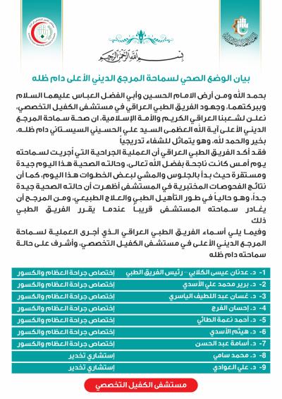 “Allah-u Teâlâ’ya hamd olsun. Halkımız Irak halkına ve İslam âlemine; Merce-i Âlâ Ayetullah Uzma Seyyid Ali Huseynî Sistanî’nin (Gölgesi daim olsun) sağlığı hakkında bir duyuruda bulunmak isteriz. Hz.İmam Huseyn ile Hz.Ebulfazl Abbas’ın (Allah’ın selâmı üzerlerine olsun) toprağının, Yüce Allah’ın onların makamına bağışladığı bereketlerin ve El-Kefîl Uzman Hastanesi’nin Iraklı tıbbi ekibinin emekleri vesilesiyle Merce-i Âlâ’nın sağlığı iyi durumdadır ve kendisi aşamalı olarak daha da iyileşmektedir.”
