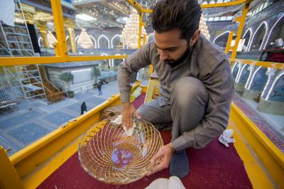 وتتضمن أعمال التنظيف إزالة الأتربة من الثريات والمرايا وتلميعها من خلال تفكيك بعض الأجزاء، واستخدام المواد الخاصة بتنظيف الزجاج، فضلاً عن استعمال بعض الآليات والرافعات للوصول الى أعلى ارتفاع في داخل الصحن الشريف للمولى أبي الفضل العباس(عليه السلام).