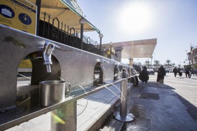في إطار سعيها الجادّ وطموحها الكبير والمتواصل لتقديم أفضل الخدمات للزائرين الكرام، الوافدين لزيارة مرقد أبي عبد الله الحسين وأخيه أبي الفضل العبّاس(عليهما السلام)، تمّ تنصيب عددٍ من مناهل شرب المياه وذلك في المناطق المحيطة بالصحن المطهّر والطرق المؤدّية اليه، وبالأخصّ التي تشهد حركةً كبيرة للزائرين، لتحلّ محلّ ما كان مستخدماً سابقاً من حافظات المياه، التي تحتاج الى جهدٍ ووقتٍ في سبيل توفير ما يحتاجه الزائر من ماء الشرب.